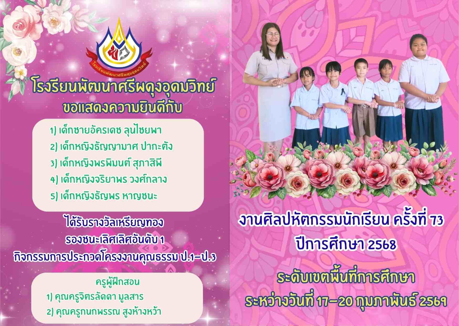 รางวัลเหรียญทอง รองชนะเลิศอันดับ 1 กิจกรรมการประกวดโครงงานคุณธรรม ป.4-ป.6 งานศิลปหัตกรรมนักเรียน ครั้งที่ 73 ระดับเขตพื้นที่การศึกษา