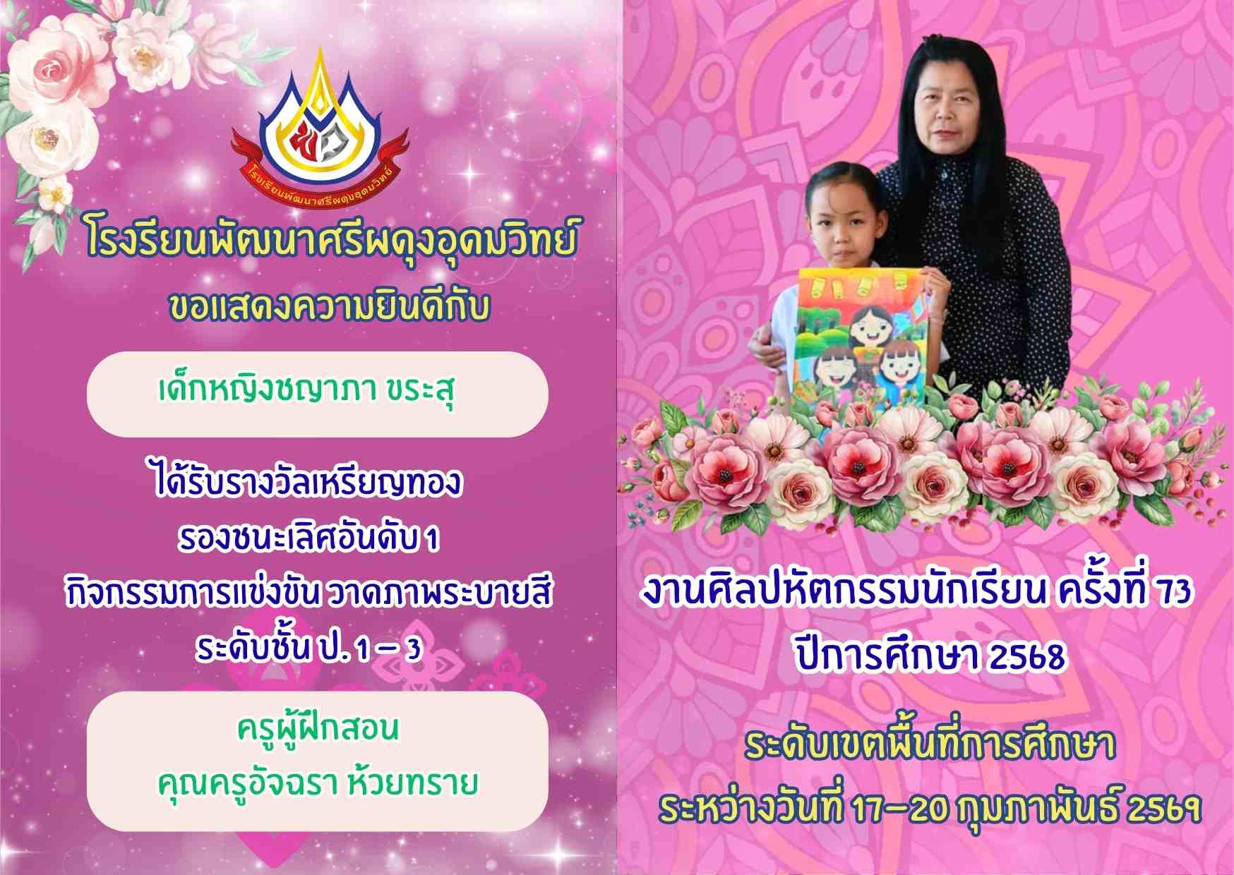 รางวัลเหรียญทอง รองชนะเลิศอันดับ 1 กิจกรรมการแข่งขัน วาดภาพระบายสี ระดับชั้น ป. 1 - 3 งานศิลปหัตกรรมนักเรียน ครั้งที่ 73 ระดับเขตพื้นที่การศึกษา
