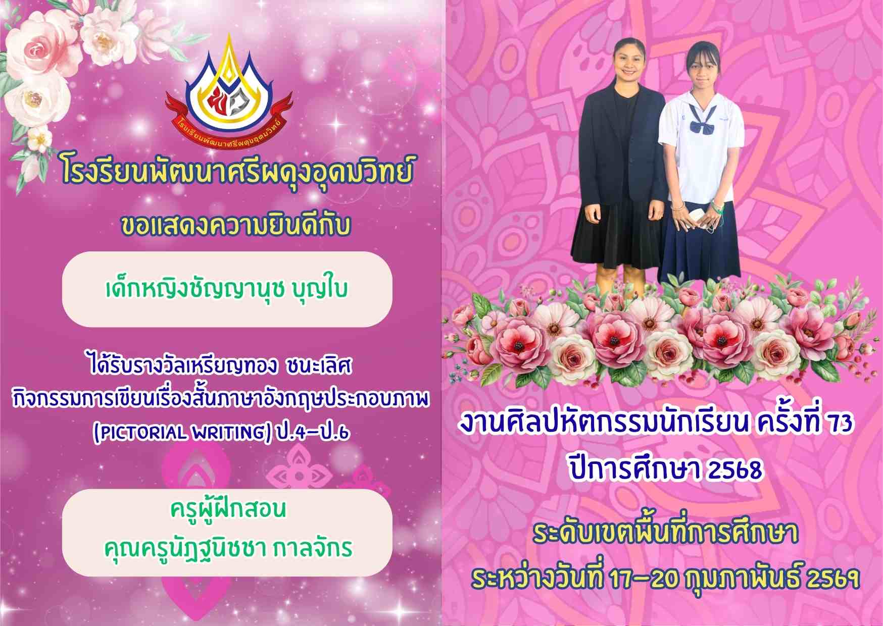 รางวัลเหรียญทอง ชนะเลิศ กิจกรรมการเขียนเรื่องสั้นภาษาอังกฤษประกอบภาพ (Pictorial Writing) ป.4-ป.6 งานศิลปหัตกรรมนักเรียน ครั้งที่ 73 ระดับเขตพื้นที่การศึกษา