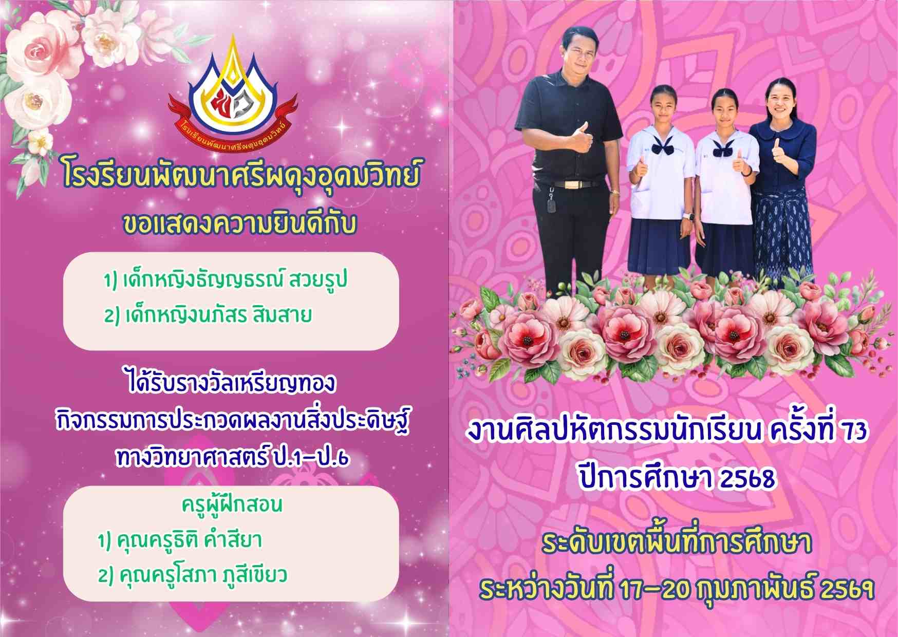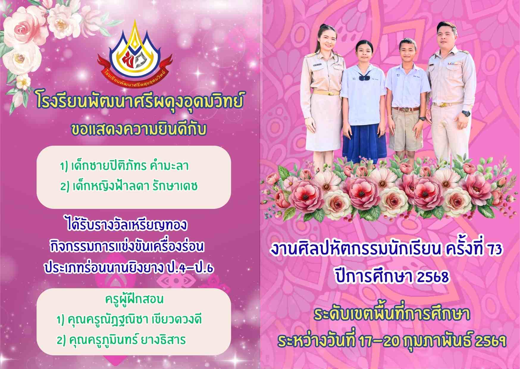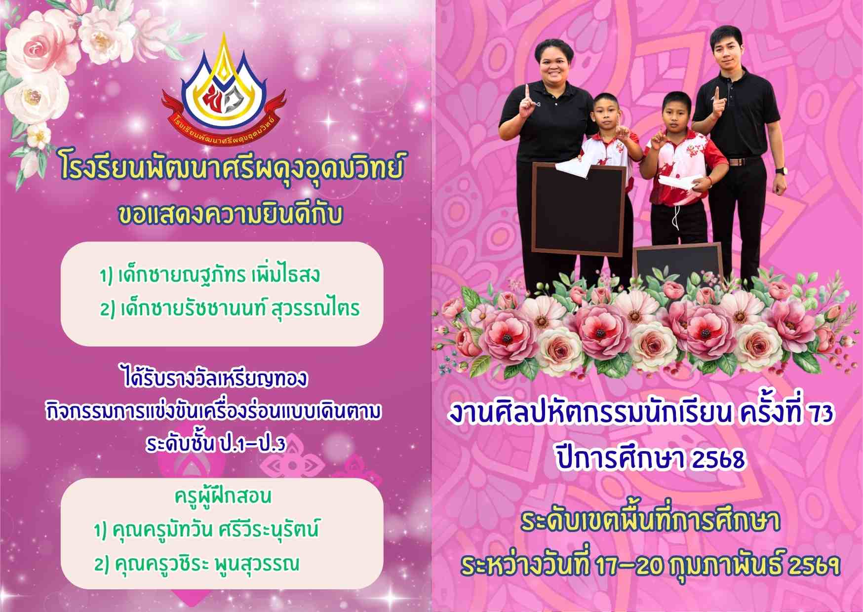 รางวัลเหรียญทอง กิจกรรมการประกวดผลงานสิ่งประดิษฐ์ ทางวิทยาศาสตร์ ป.1-ป.6 งานศิลปหัตกรรมนักเรียน ครั้งที่ 73 ระดับเขตพื้นที่การศึกษา