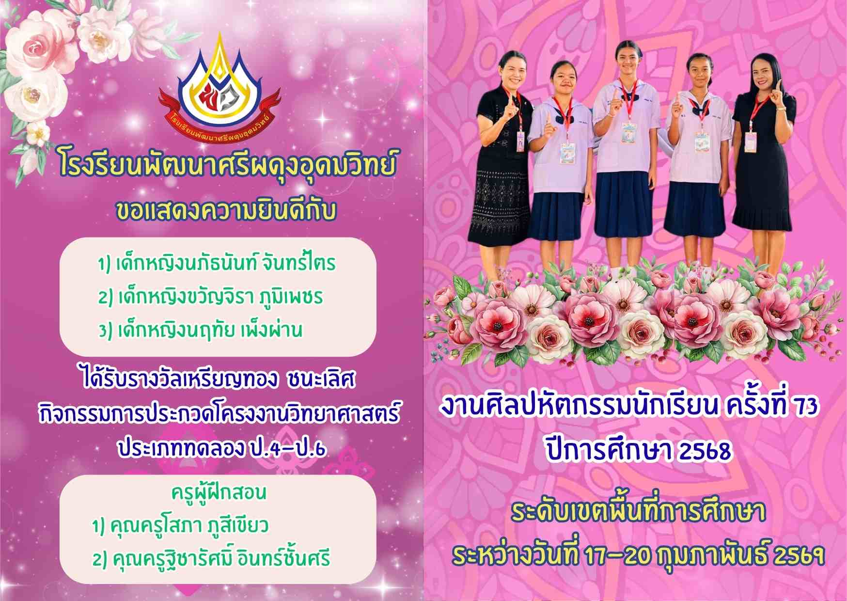 รางวัลเหรียญทอง ชนะเลิศ กิจกรรมการประกวดโครงงานวิทยาศาสตร์ ประเภททดลอง ป.4-ป.6 งานศิลปหัตกรรมนักเรียน ครั้งที่ 73 ระดับเขตพื้นที่การศึกษา