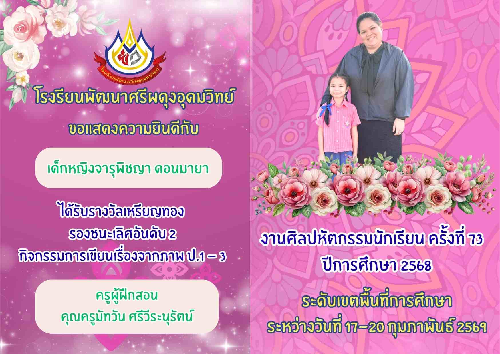 รางวัลเหรียญทอง รองชนะเลิศอันดับ 2 กิจกรรมการเขียนเรื่องจากภาพ ป.1 - 3 งานศิลปหัตกรรมนักเรียน ครั้งที่ 73 ระดับเขตพื้นที่การศึกษา