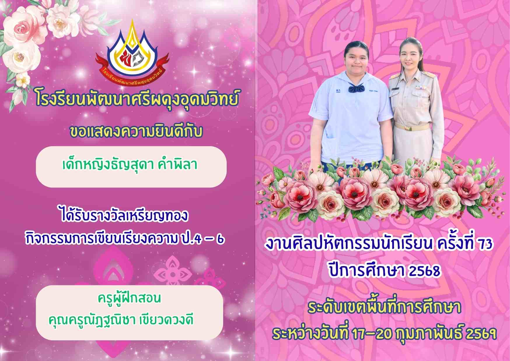 รางวัลเหรียญทอง กิจกรรมกวีเยาวชนคนรุ่นใหม่ กลอนสี่ (4 บท) ป.4 - 6 งานศิลปหัตกรรมนักเรียน ครั้งที่ 73 ระดับเขตพื้นที่การศึกษา