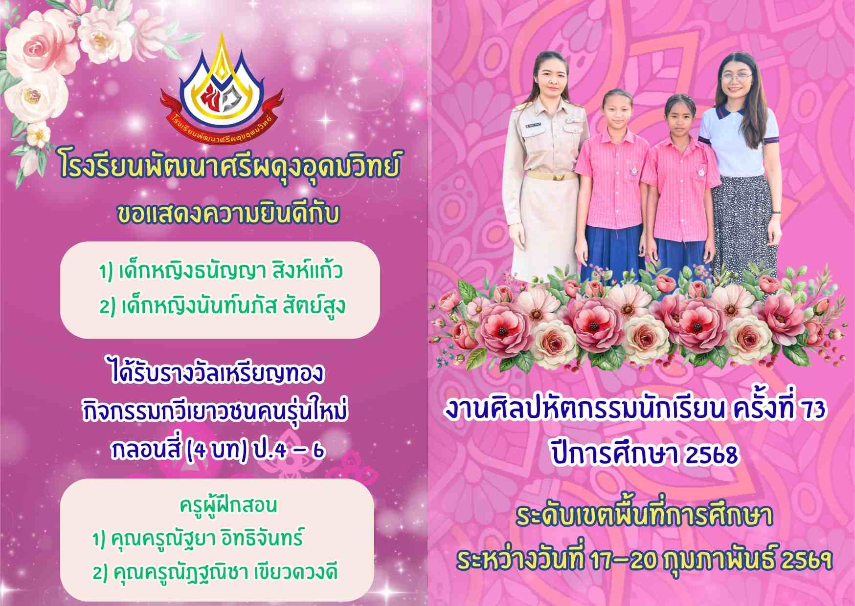 รางวัลเหรียญทอง กิจกรรมการประกวดเพลงคุณธรรม ป.1-ป.3 งานศิลปหัตกรรมนักเรียน ครั้งที่ 73 ระดับเขตพื้นที่การศึกษา