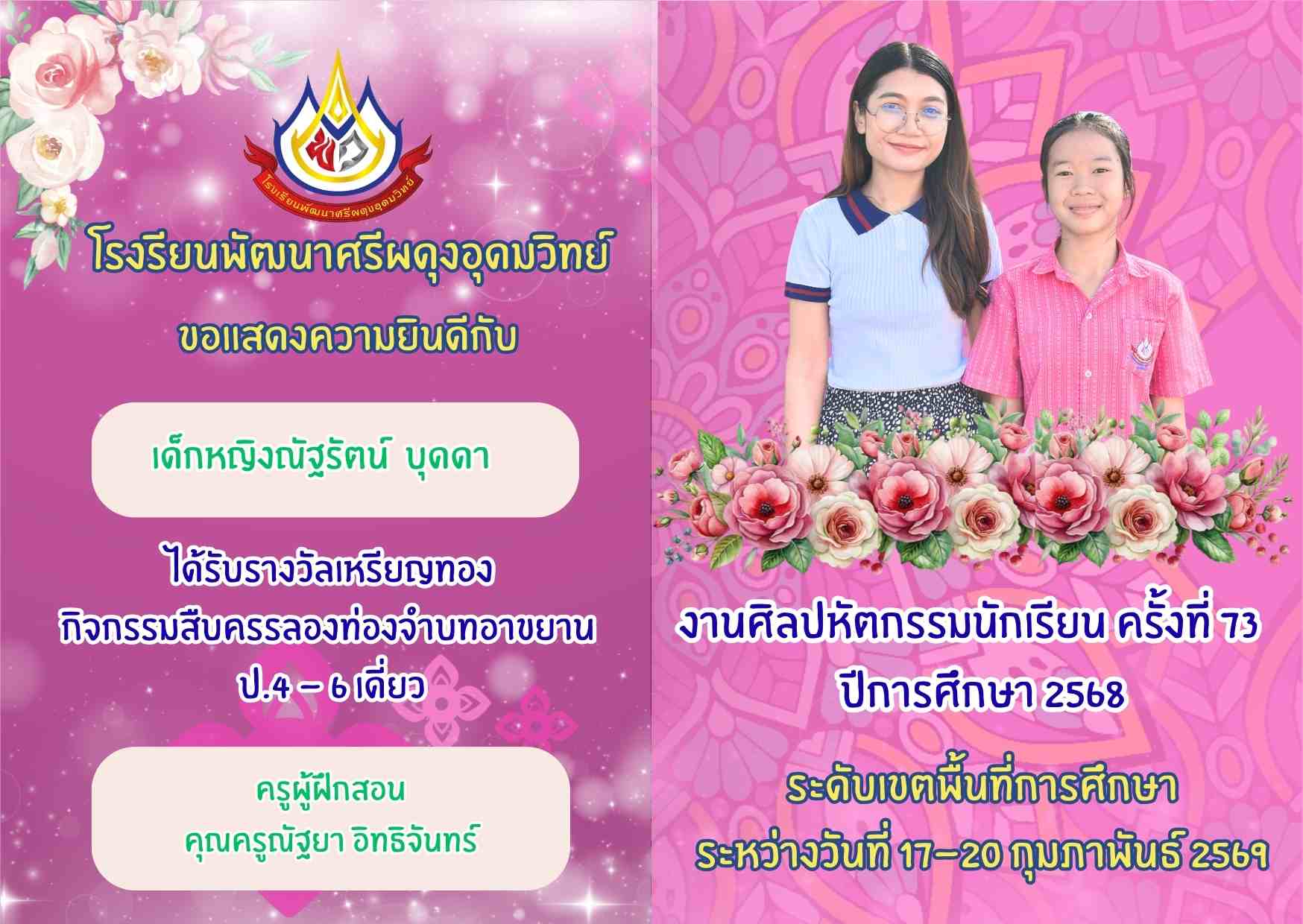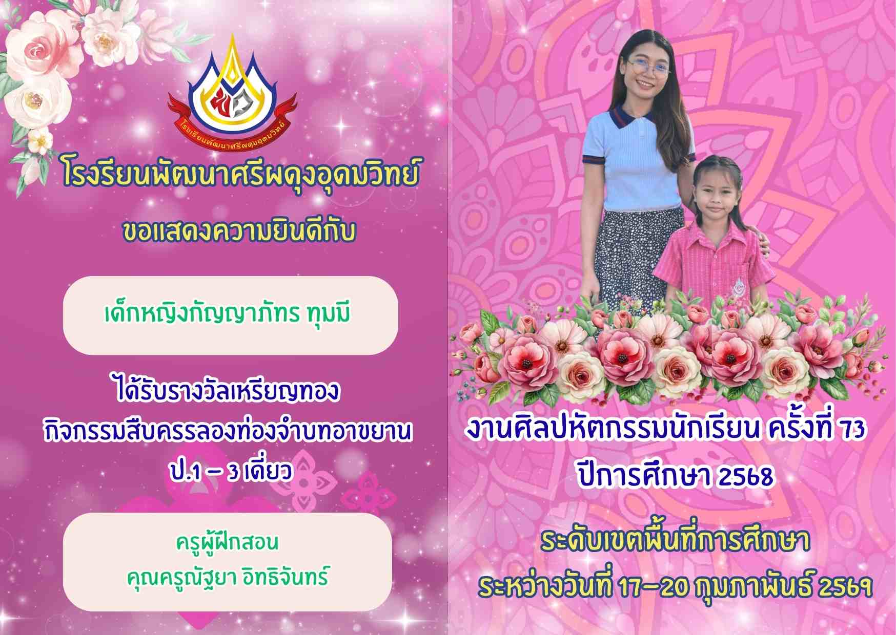 รางวัลเหรียญทอง กิจกรรมสืบครรลองท่องจำบทอาขยาน ป.1 - 3 เดี่ยว งานศิลปหัตกรรมนักเรียน ครั้งที่ 73 ระดับเขตพื้นที่การศึกษา