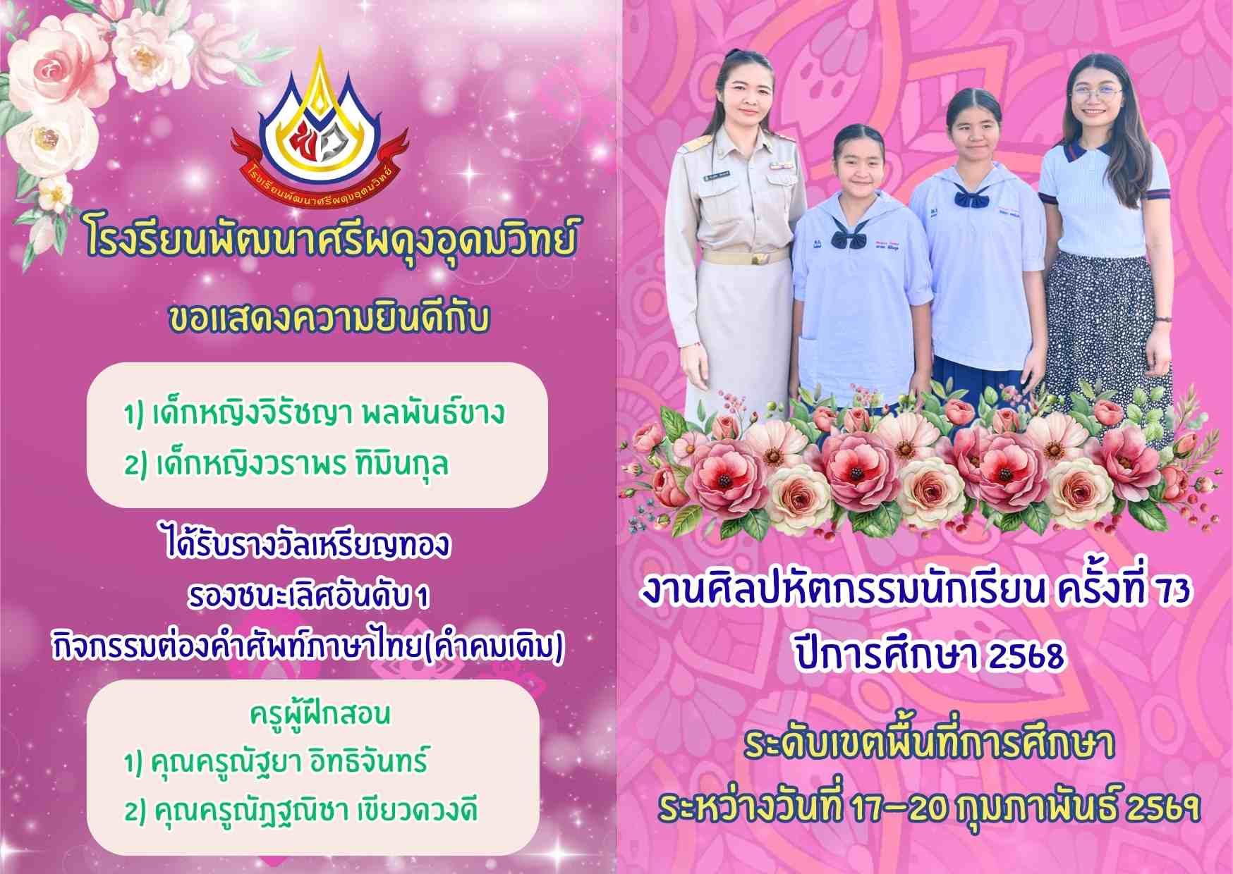 รางวัลเหรียญทอง รองชนะเลิศอันดับ 1 กิจกรรมต่องคำศัพท์ภาษาไทย(คำคมเดิม) งานศิลปหัตกรรมนักเรียน ครั้งที่ 73 ระดับเขตพื้นที่การศึกษา
