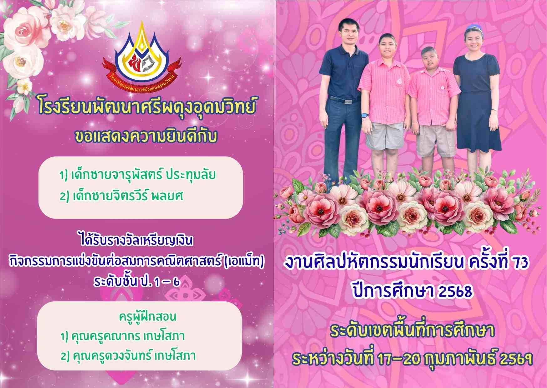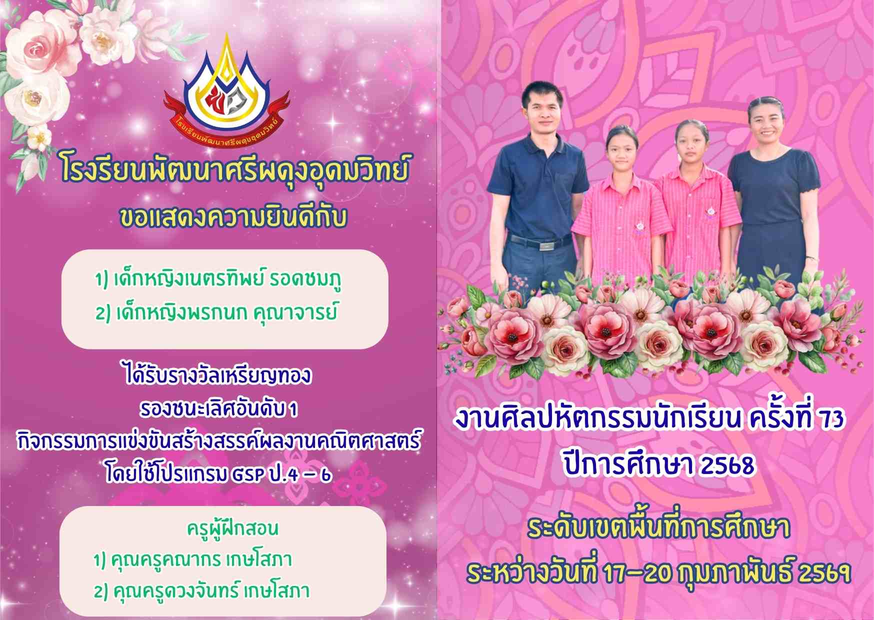 รางวัลเหรียญทอง รองชนะเลิศอันดับ 1 กิจกรรมการแข่งขันสร้างสรรค์ผลงานคณิตศาสตร์โดยใช้โปรแกรม GSP ป.4 - 6 งานศิลปหัตกรรมนักเรียน ครั้งที่ 73 ระดับเขตพื้นที่การศึกษา
