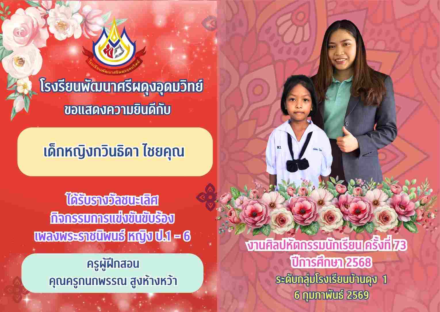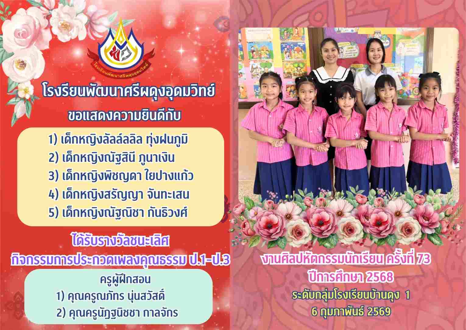 รางวัลชนะเลิศ กิจกรรมการประกวดเพลงคุณธรรม ป.1-ป.3 งานศิลปหัตกรรมนักเรียน ครั้งที่ 73 ปีการศึกษา 2568