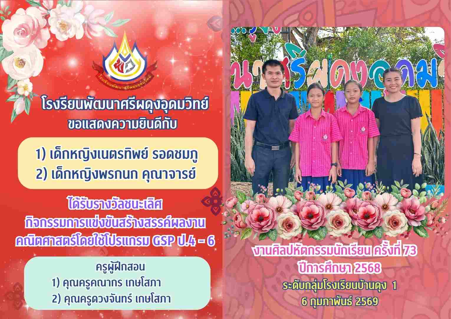 รางวัลชนะเลิศ กิจกรรมการแข่งขันสร้างสรรค์ผลงานคณิตศาสตร์โดยใช้โปรแกรม GSP ป.4 - 6 งานศิลปหัตกรรมนักเรียน ครั้งที่ 73 ปีการศึกษา 2568