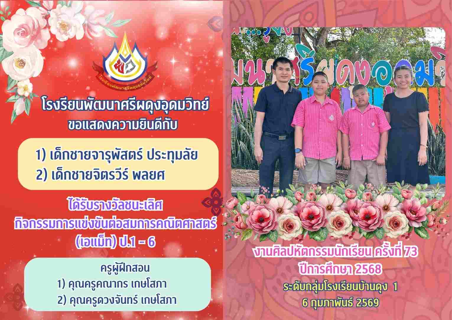 รางวัลชนะเลิศ กิจกรรมการแข่งขันต่อสมการคณิตศาสตร์ (เอแม็ท) ป.1 - 6 งานศิลปหัตกรรมนักเรียน ครั้งที่ 73 ปีการศึกษา 2568
