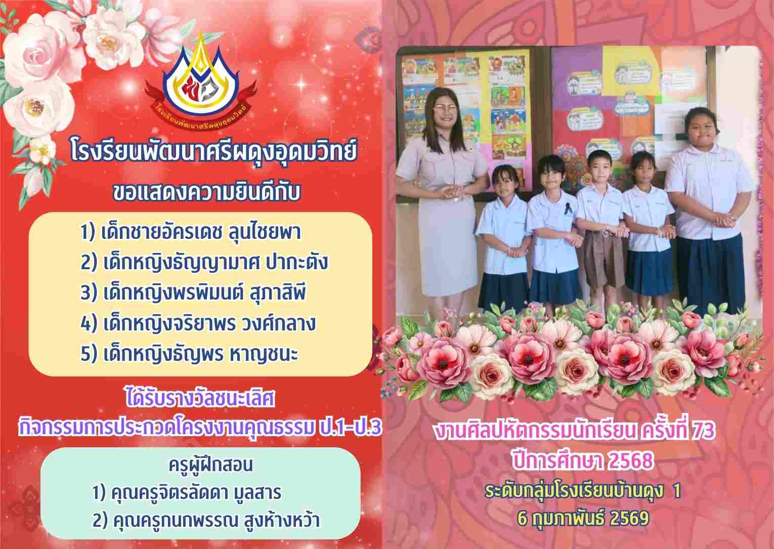 รางวัลชนะเลิศ กิจกรรมการประกวดโครงงานคุณธรรม ป.1-ป.3 งานศิลปหัตกรรมนักเรียน ครั้งที่ 73 ปีการศึกษา 2568