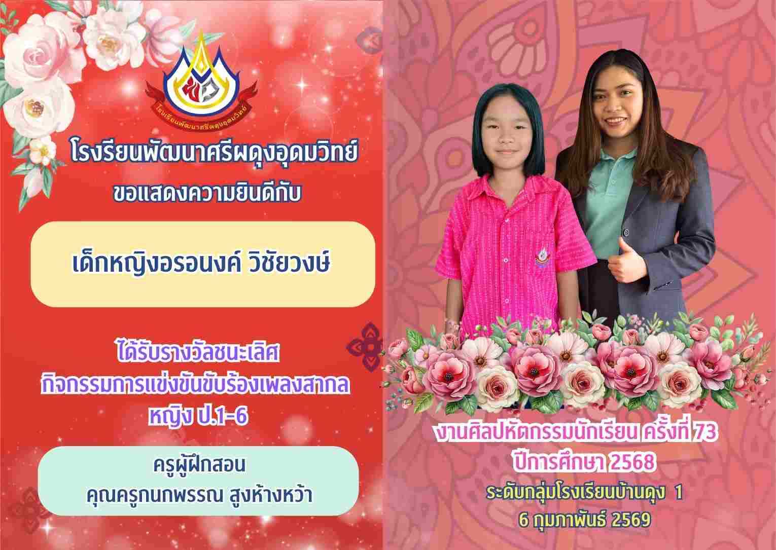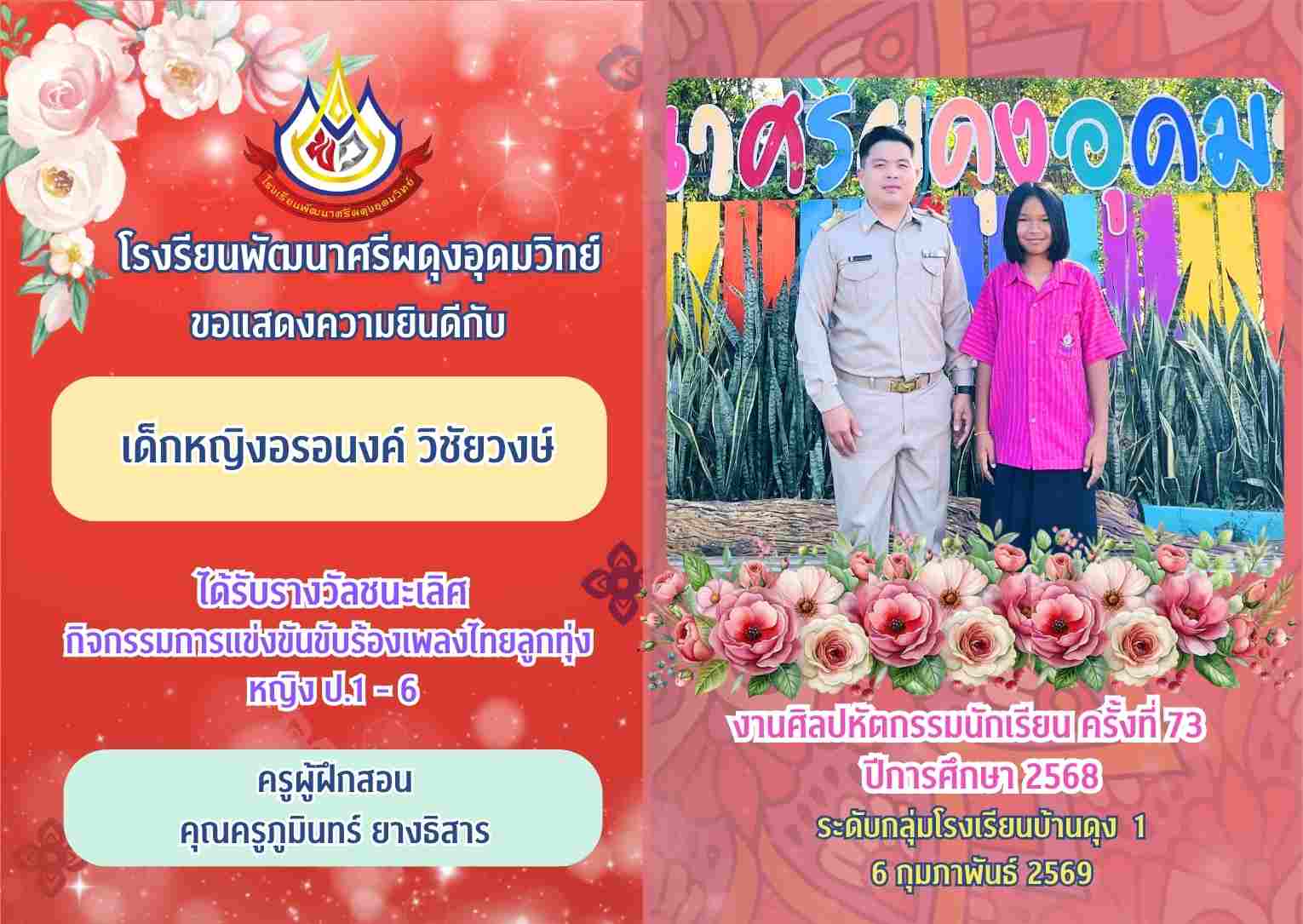 รางวัลชนะเลิศ กิจกรรมการแข่งขันขับร้องเพลงไทยลูกทุ่ง หญิง ป.1 - 6 งานศิลปหัตกรรมนักเรียน ครั้งที่ 73 ปีการศึกษา 2568