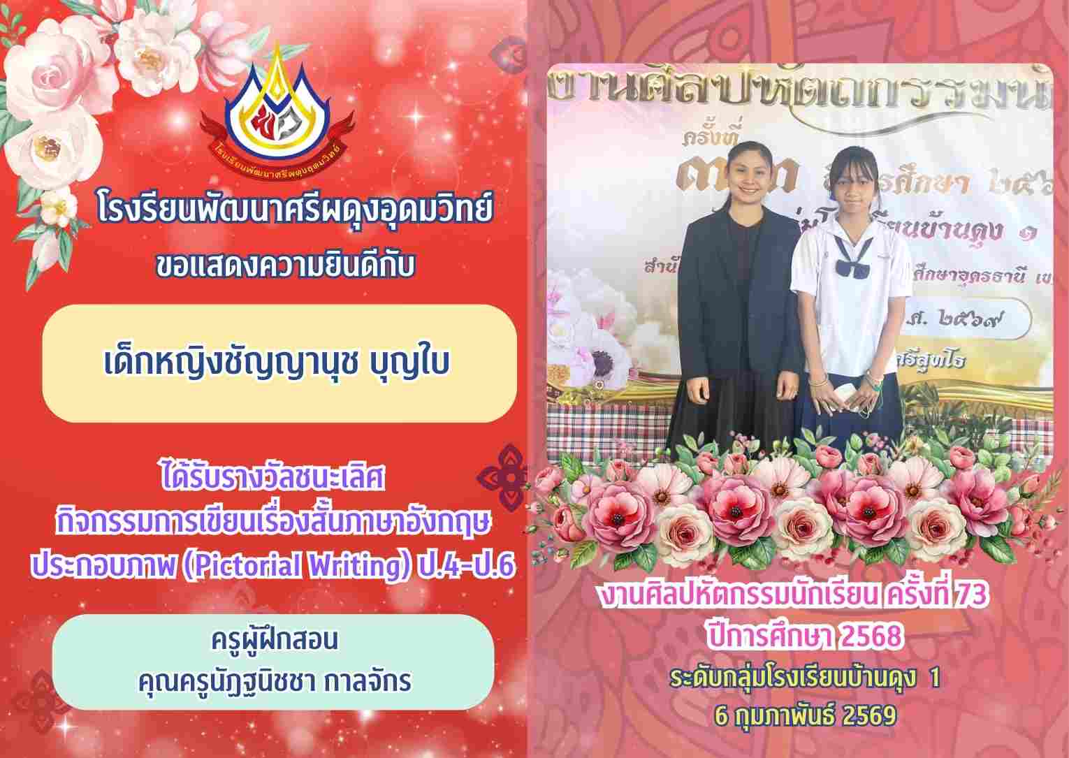 รางวัลชนะเลิศ กิจกรรมการเขียนเรื่องสั้นภาษาอังกฤษประกอบภาพ (Pictorial Writing) ป.4-ป.6 งานศิลปหัตกรรมนักเรียน ครั้งที่ 73 ปีการศึกษา 2568