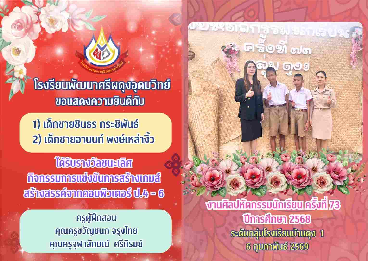 รางวัลชนะเลิศ กิจกรรมการแข่งขันการสร้างเกมส์สร้างสรรค์จากคอมพิวเตอร์ ป.4 - 6 งานศิลปหัตกรรมนักเรียน ครั้งที่ 73 ปีการศึกษา 2568