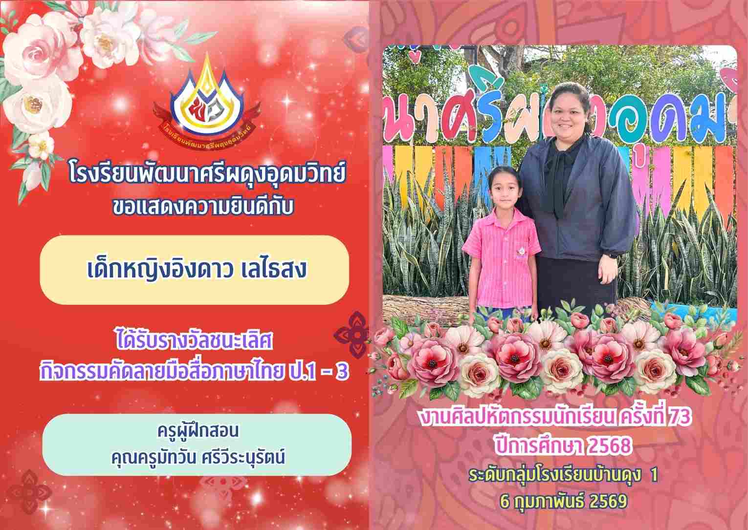 รางวัลชนะเลิศ กิจกรรมคัดลายมือสื่อภาษาไทย ป.1 - 3 งานศิลปหัตกรรมนักเรียน ครั้งที่ 73 ปีการศึกษา 2568
