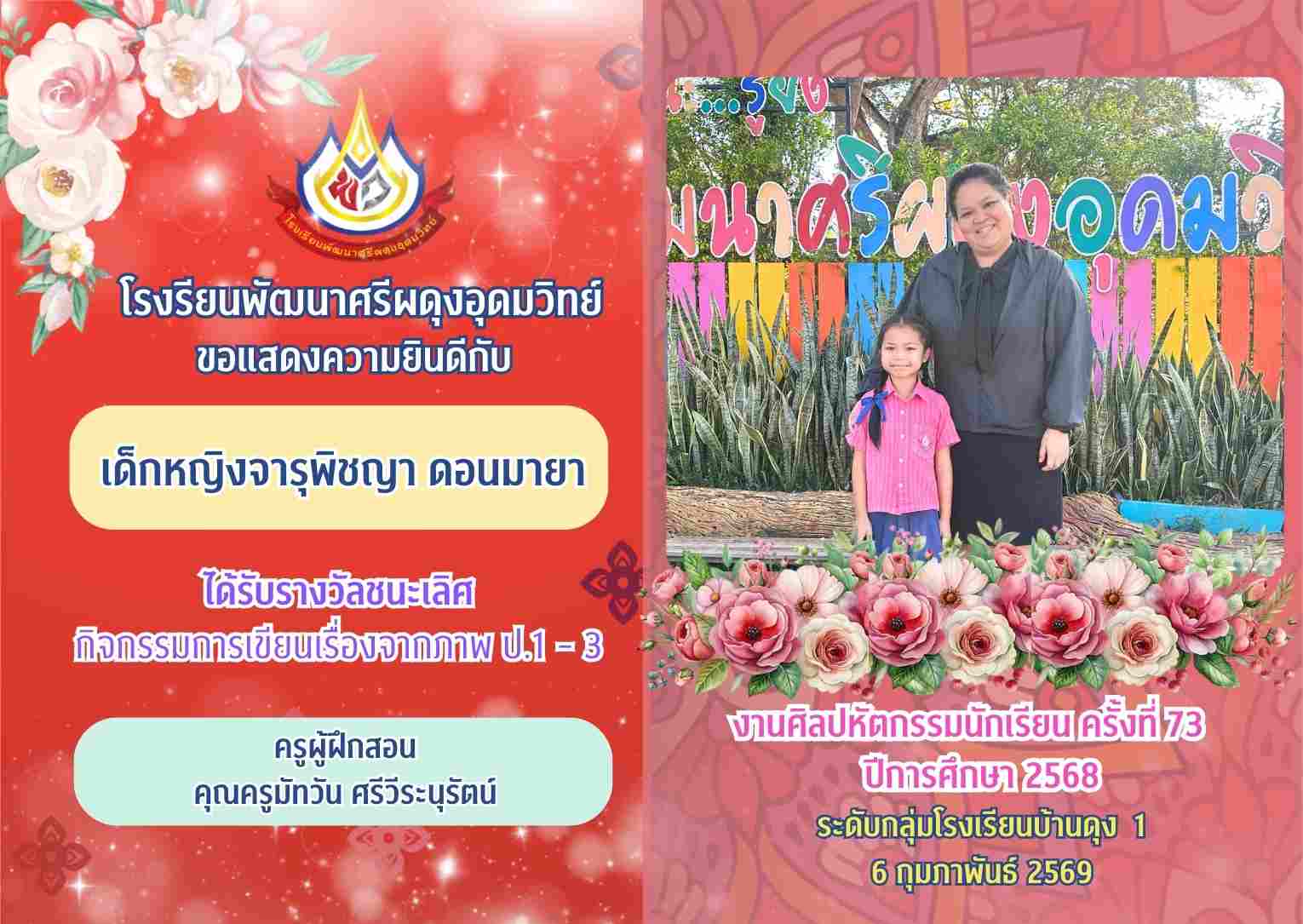 รางวัลชนะเลิศ กิจกรรมการเขียนเรื่องจากภาพ ป.1 - 3 งานศิลปหัตกรรมนักเรียน ครั้งที่ 73 ปีการศึกษา 2568