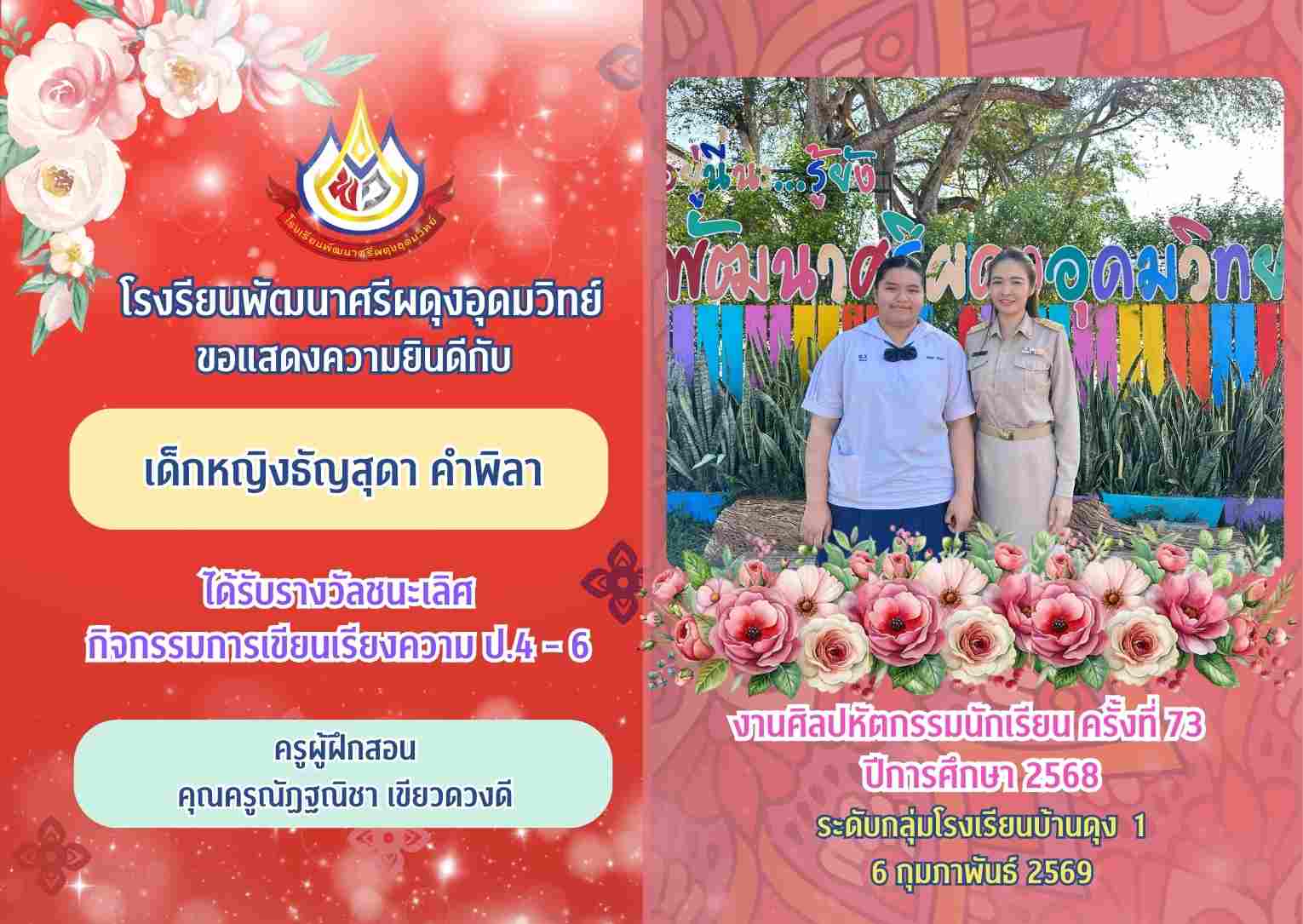 รางวัลชนะเลิศ กิจกรรมการเขียนเรียงความ ป.4 - 6 งานศิลปหัตกรรมนักเรียน ครั้งที่ 73 ปีการศึกษา 2568