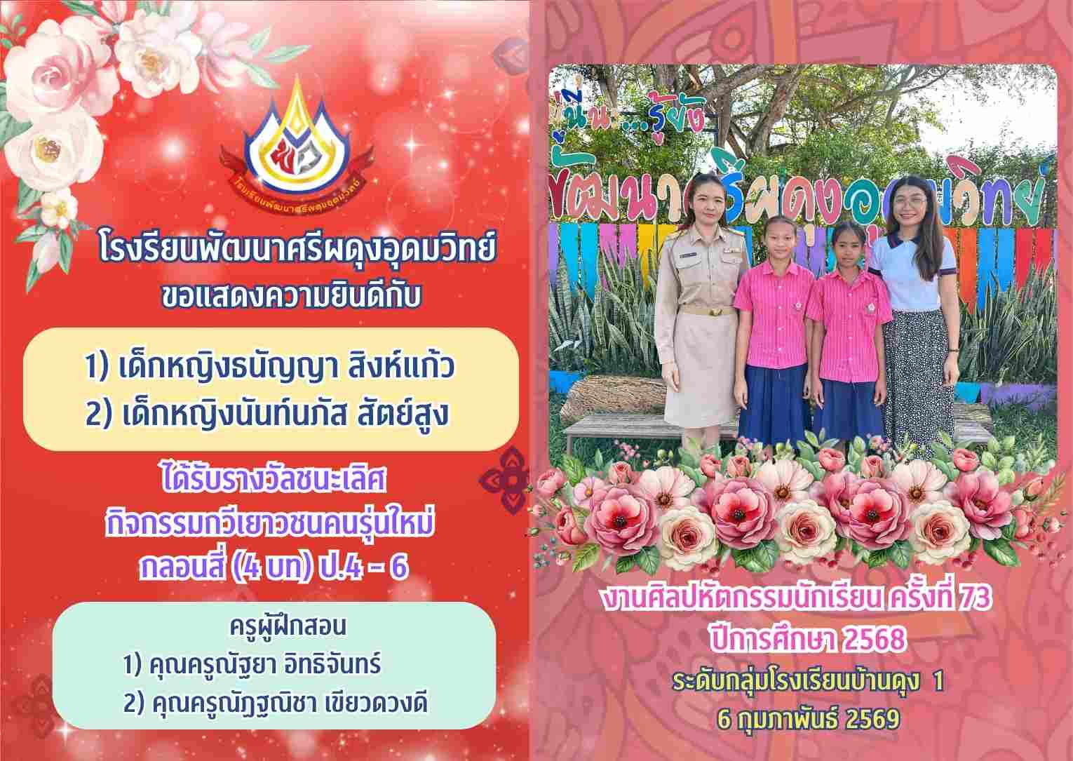รางวัลชนะเลิศ กิจกรรมกวีเยาวชนคนรุ่นใหม่ กลอนสี่ (4 บท) ป.4 - 6 งานศิลปหัตกรรมนักเรียน ครั้งที่ 73 ปีการศึกษา 2568
