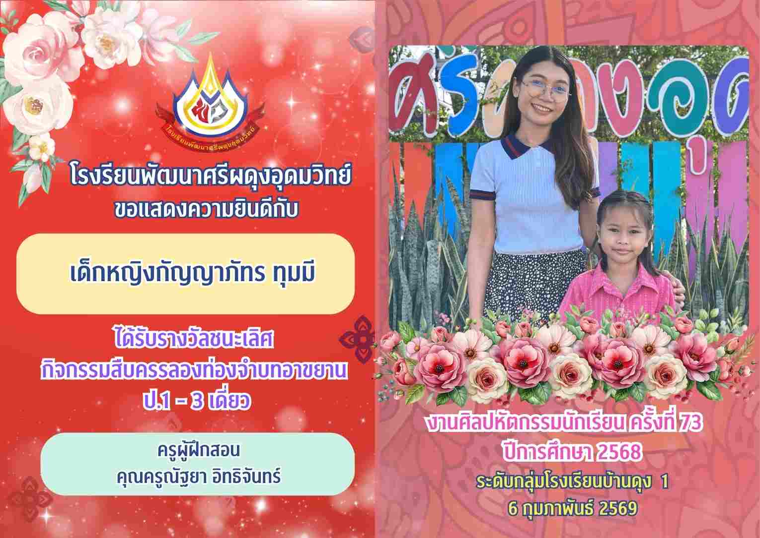 รางวัลชนะเลิศ กิจกรรมสืบครรลองท่องจำบทอาขยาน ป.1 - 3 เดี่ยว งานศิลปหัตกรรมนักเรียน ครั้งที่ 73 ปีการศึกษา 2568