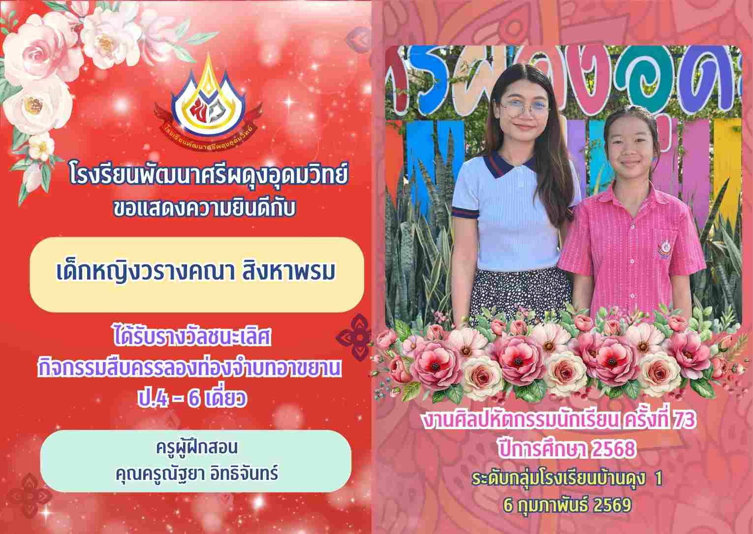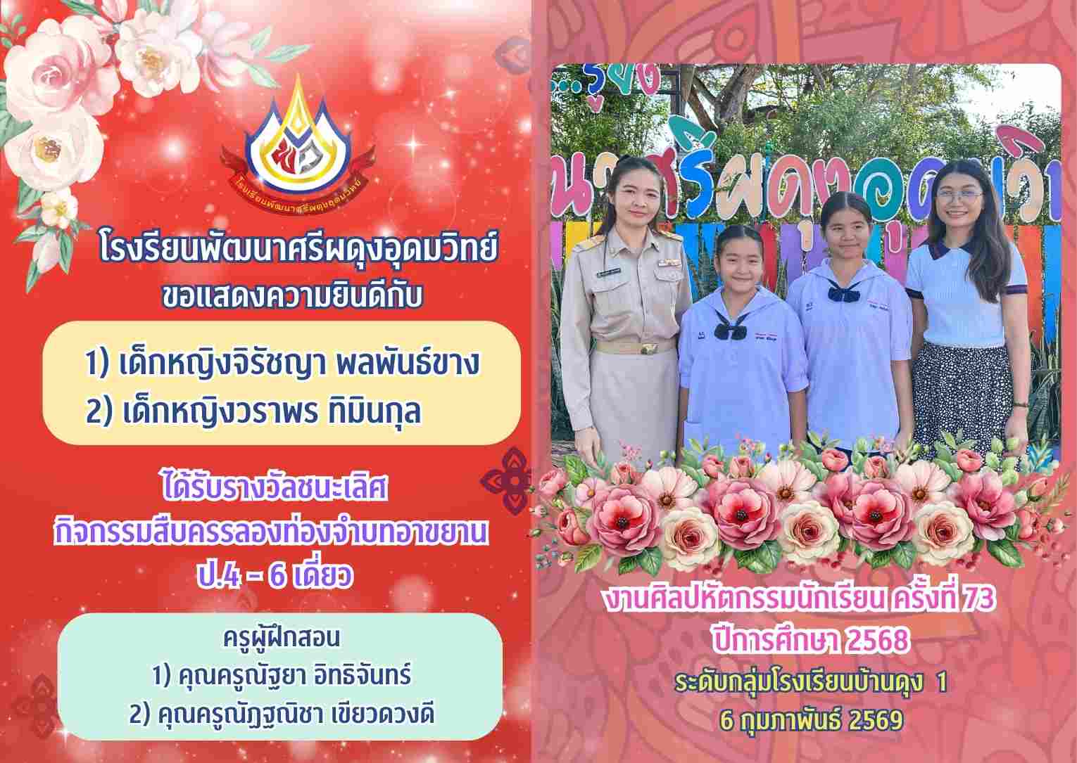 างวัลชนะเลิศ กิจกรรมสืบครรลองท่องจำบทอาขยาน ป.4 - 6 เดี่ยว งานศิลปหัตกรรมนักเรียน ครั้งที่ 73 ปีการศึกษา 2568