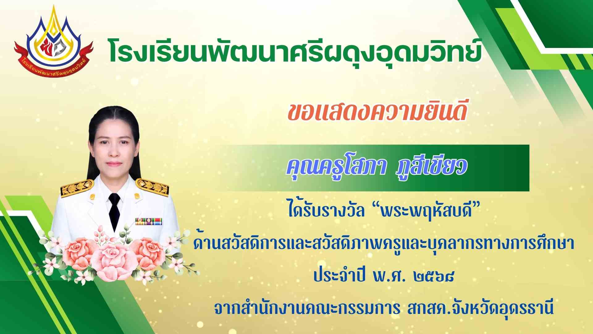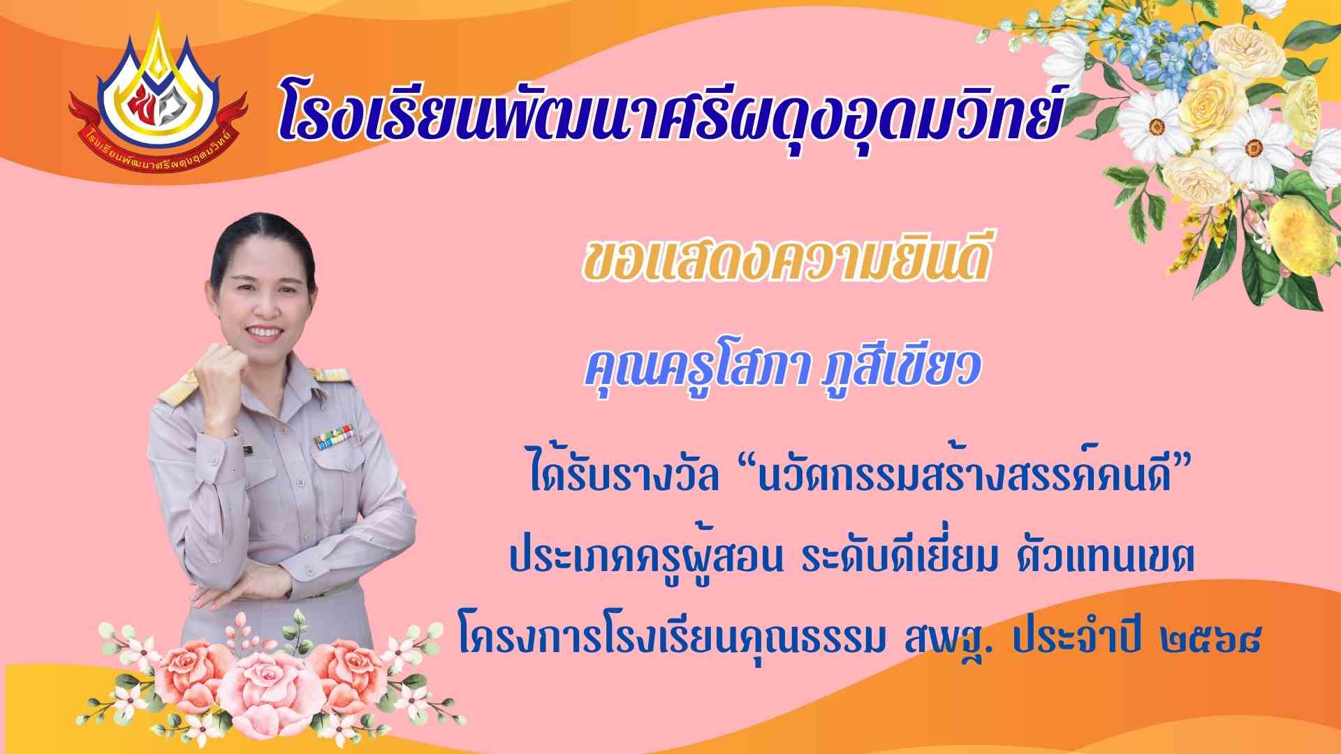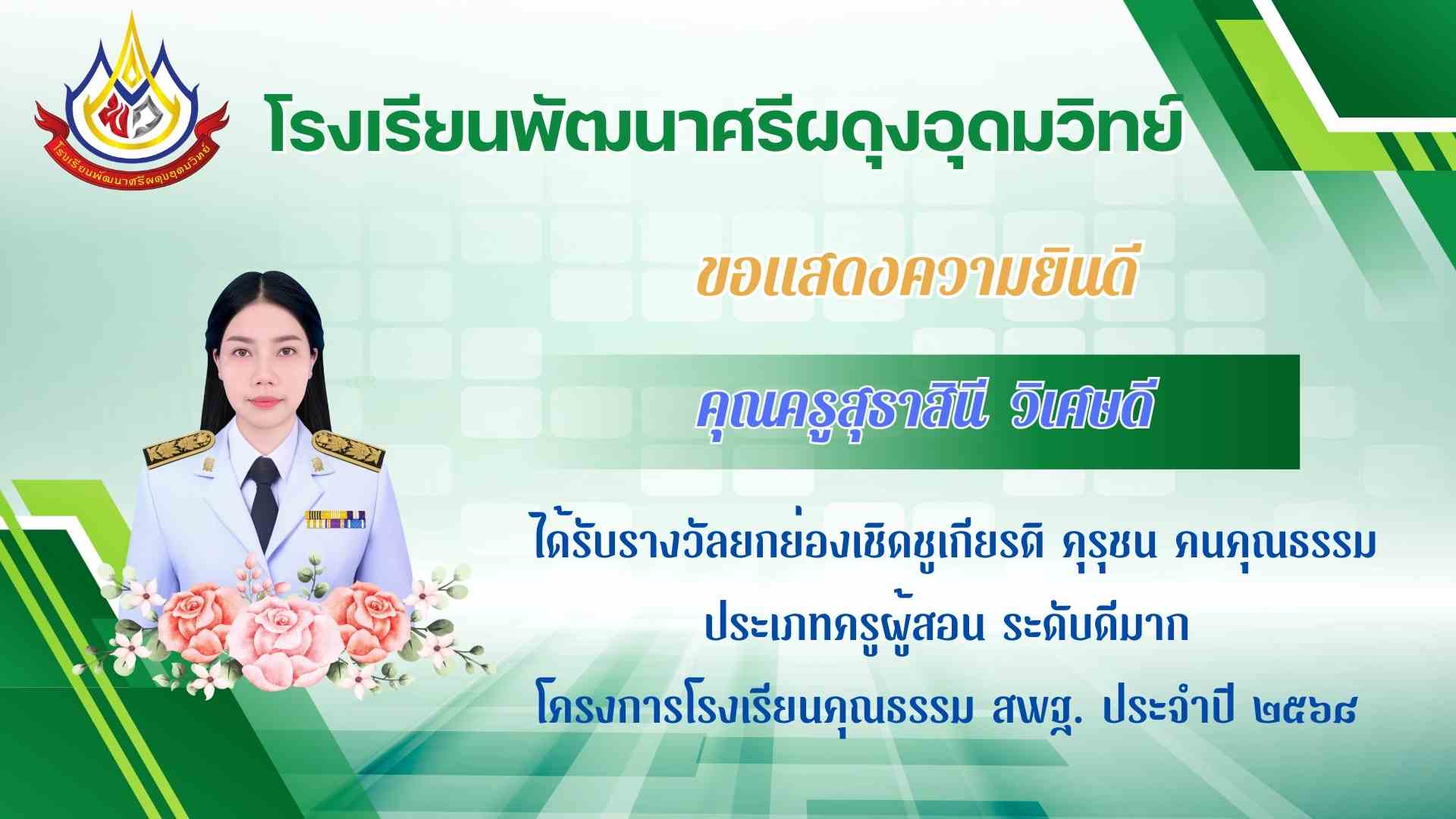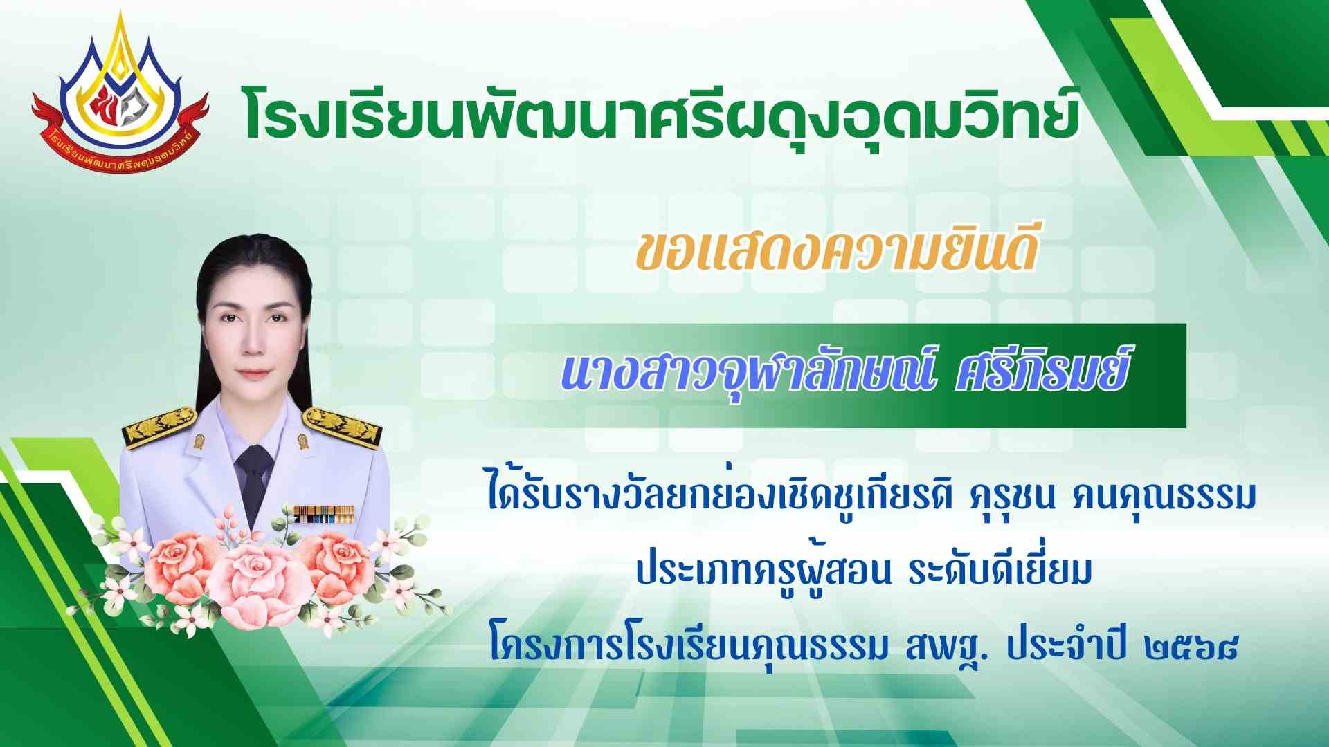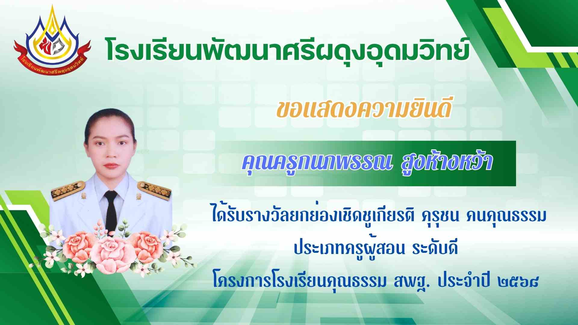 ได้รับรางวัลยกย่องเชิดชูเกียรติ คุรุชน คนคุณธรรม ประเภทครูผู้สอน ระดับดีเยี่ยม ตัวแทนเขต โครงการโรงเรียนคุณธรรม สพฐ. ประจำปี ๒๕๖๘ |