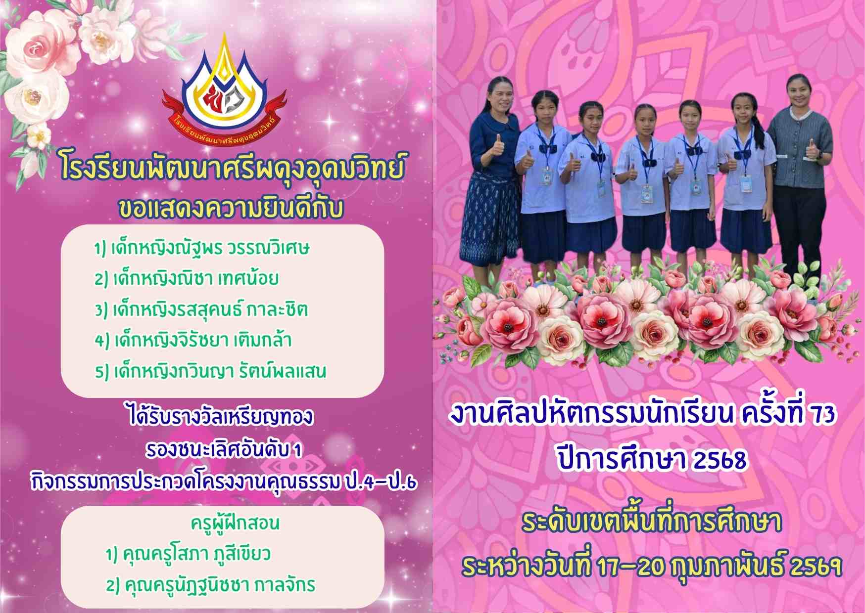 รางวัลเหรียญทอง รองชนะเลิศอันดับ 1 กิจกรรมการประกวดโครงงานคุณธรรม ป.4-ป.6 งานศิลปหัตกรรมนักเรียน ครั้งที่ 73 ระดับเขตพื้นที่การศึกษา