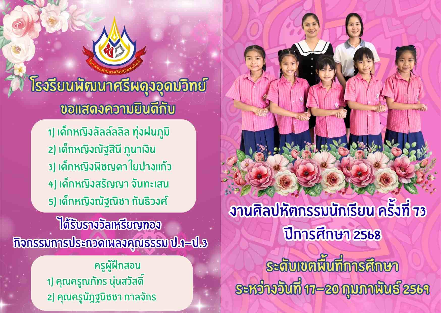 รางวัลเหรียญทอง กิจกรรมการประกวดเพลงคุณธรรม ป.1-ป.3 งานศิลปหัตกรรมนักเรียน ครั้งที่ 73 ระดับเขตพื้นที่การศึกษา