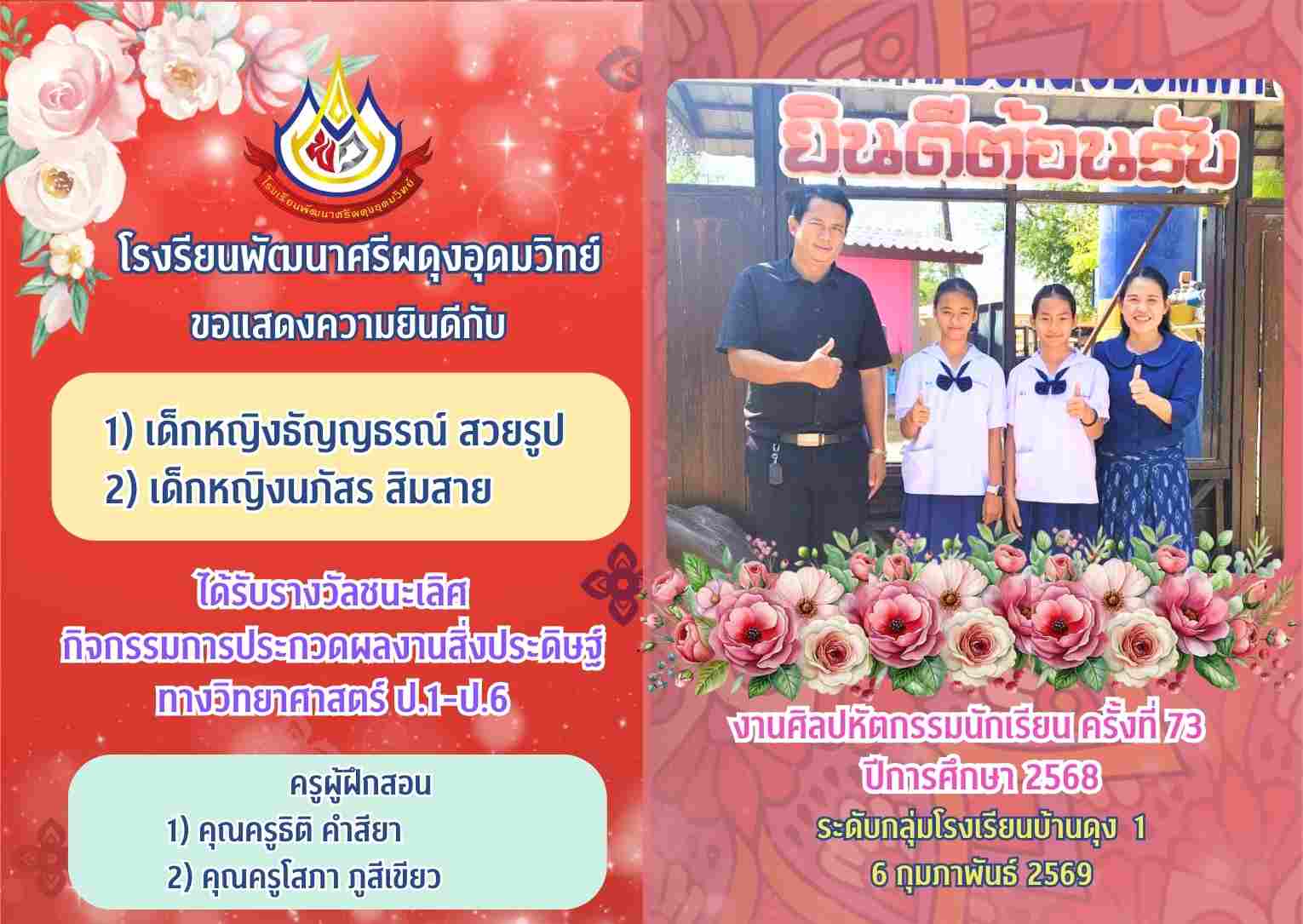 รางวัลชนะเลิศ กิจกรรมการประกวดผลงานสิ่งประดิษฐ์ ทางวิทยาศาสตร์ ป.1-ป.6 งานศิลปหัตกรรมนักเรียน ครั้งที่ 73 ปีการศึกษา 2568