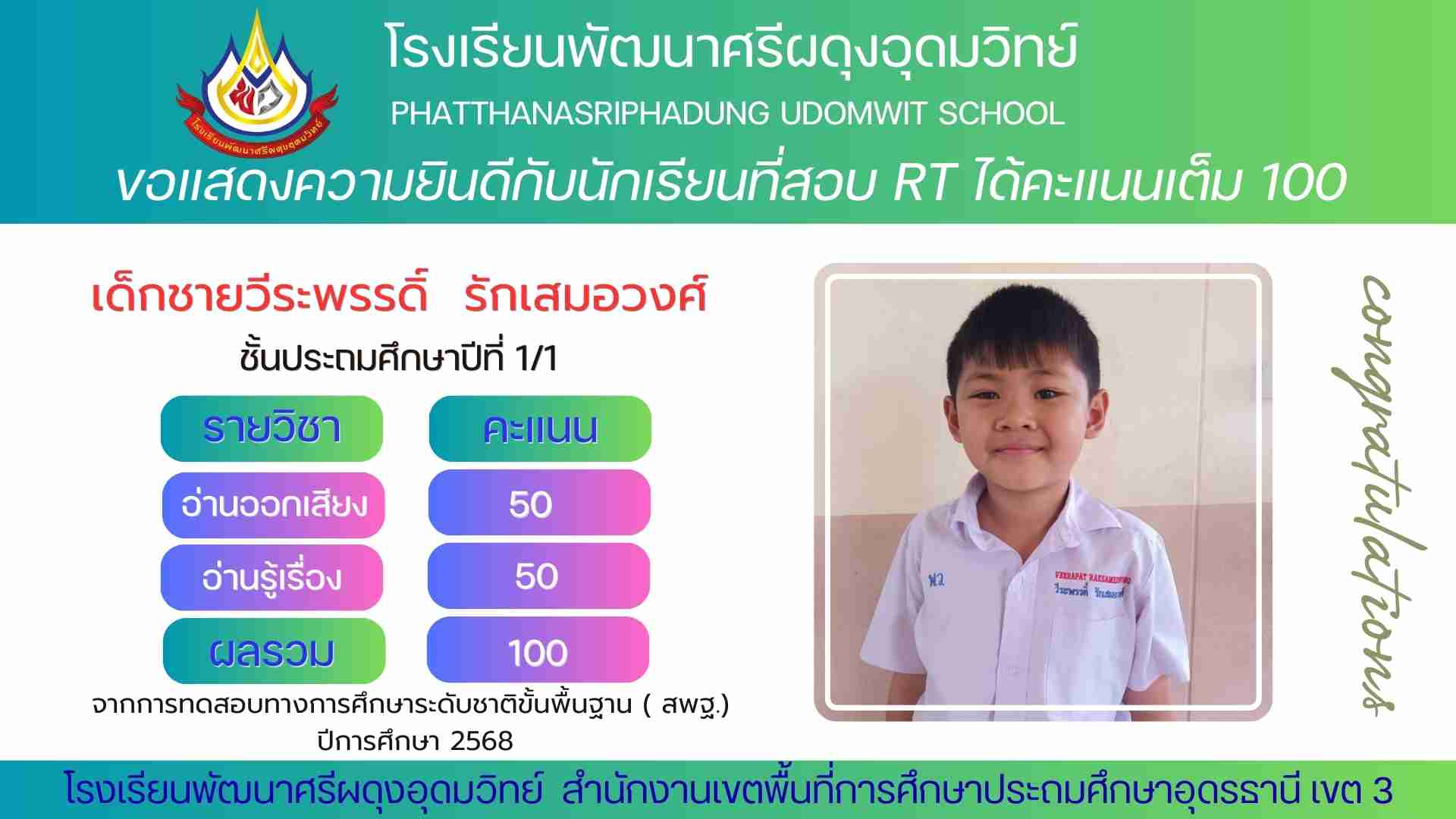 นักเรียนที่สอบ RT ได้คะแนนเต็ม 100